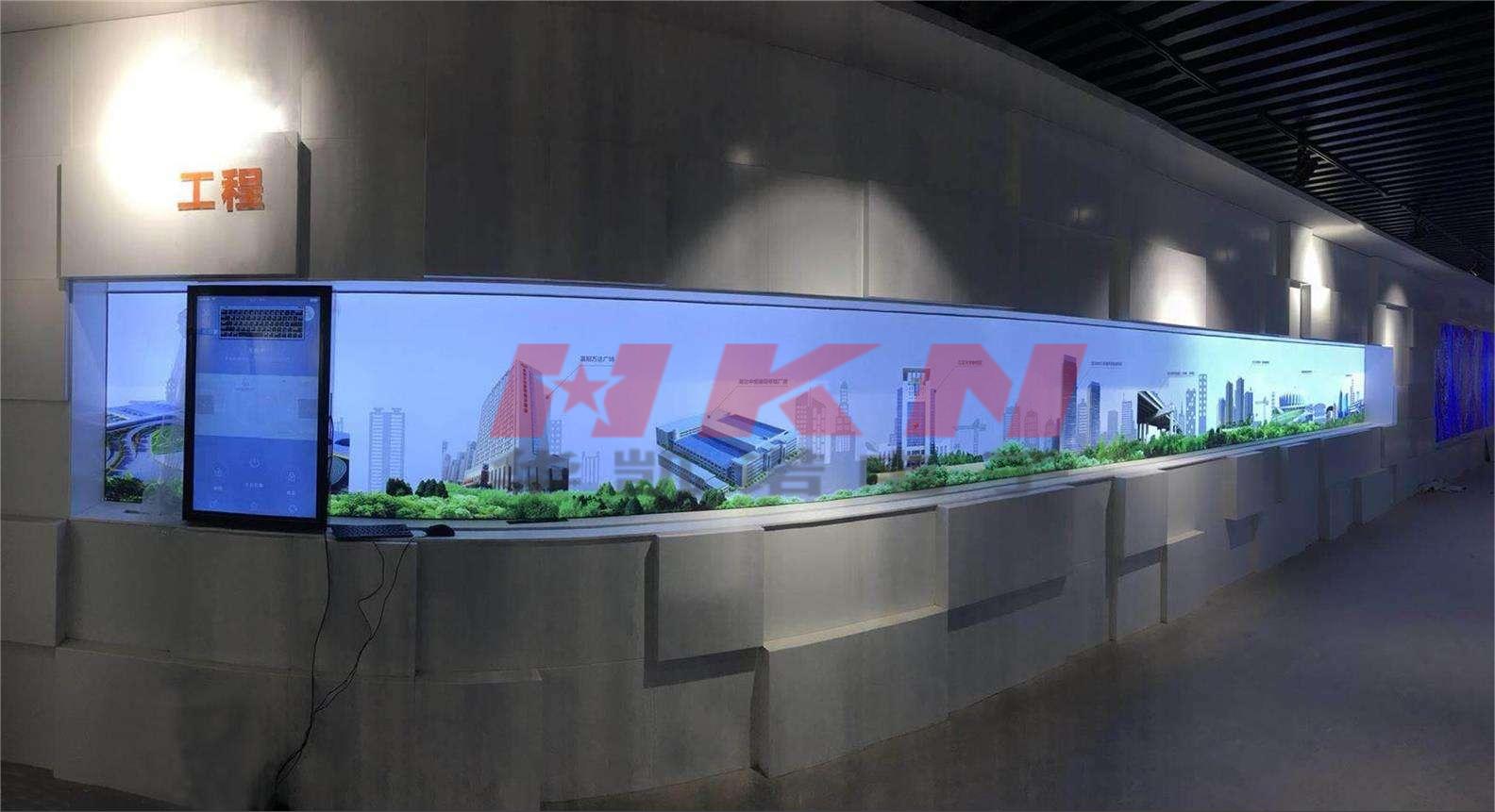 為了滿足展廳展示的需要,在場地受限的情況下,可以采用直線滑軌加弧形滑軌的方式,平滑過渡曲面,延長滑軌屏滑動(dòng)范圍。同時(shí)增加科技感,增加視覺觀賞感。